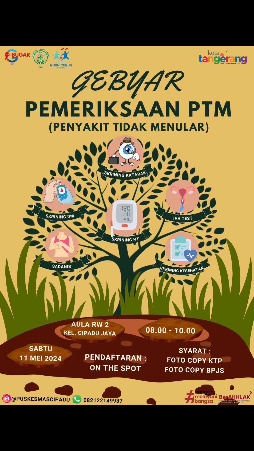 Larangan - UPT Puskesmas Cipadu bekerjasama dengan Rumah Sakit Murni Teguh Ciledug akan mengadakan kegiatan GEBYAR PEMERIKSAAN Penyakit Tidak Menular (PTM) dalam rangka Pencegahan Pengendalian Penyakit Tidak Menular (PTM) di wilayah kerja Puskesmas Cipadu.