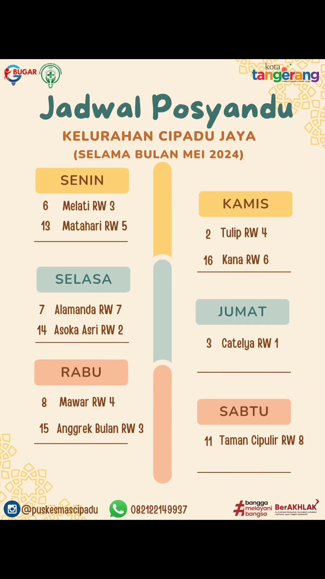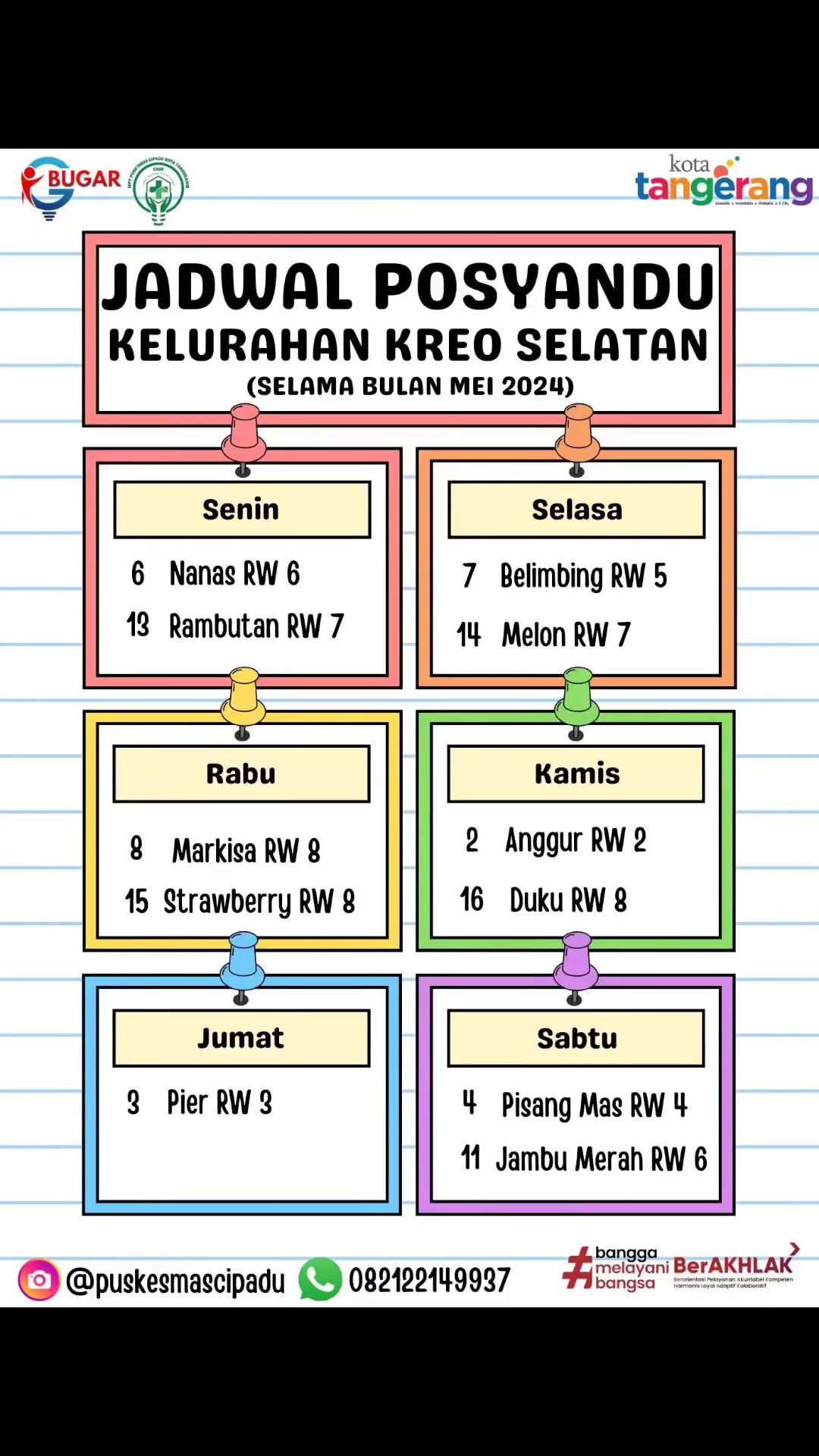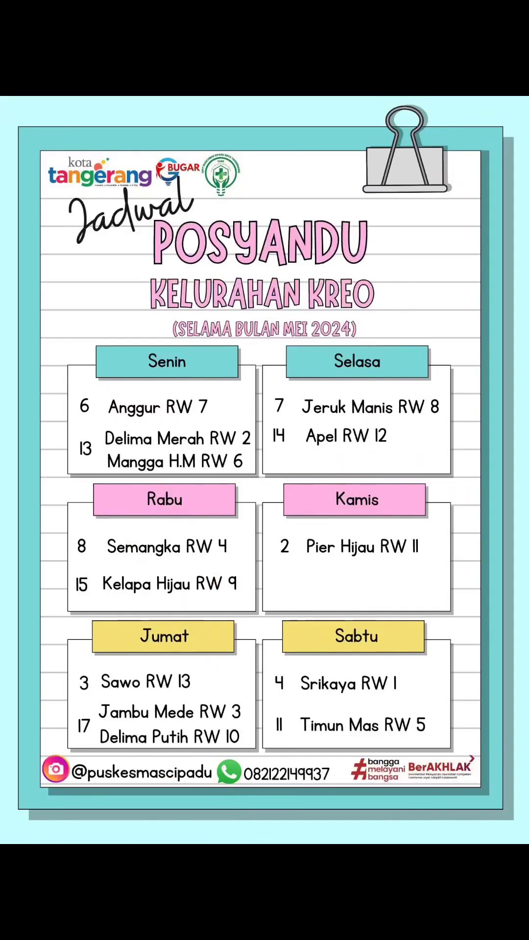 Berikut Jadwal Posyandu bulan Mei 2024 di wilayah kerja Puskesmas Cipadu yang terdiri dari 4 kelurahan yaitu Kelurahan Kreo, Kreo Selatan, Cipadu dan Cipadu Jaya.