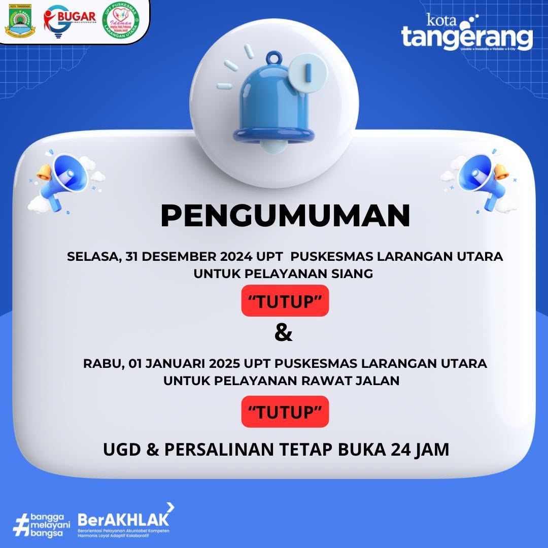 Dilansir dari unggahan instagram @puskesmas_larangan_utara, Pelayanan siang pada Selasa, 31 Desember 2024 dan pelayanan Rawat Jalan di Puskesmas Larangan Utara pada Rabu, 1 Januari 2025 akan tutup sementara atau tidak melayani warga. Namun pelayanan Unit Gawat Darurat (UGD) dan pelayanan Persalinan (PONED) tetap buka selama 24 jam.